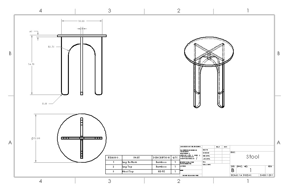 This CAD Drawing shows the dimensions used in the stool, as well as the different components which are the two bamboo legs and the top made from recycled HDPE.